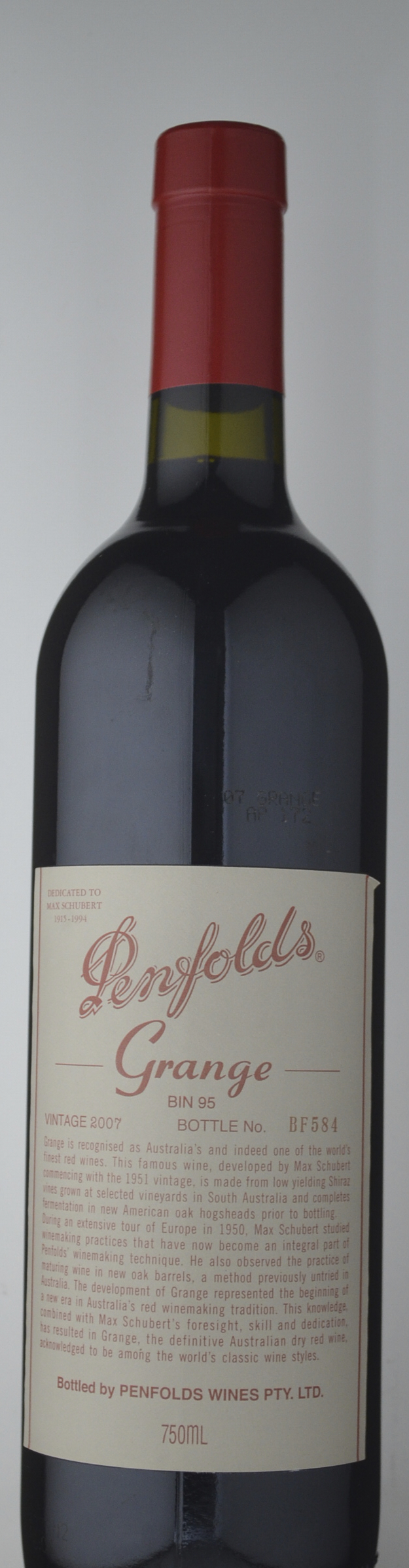 2007 is a thoroughly worthy Grange and an outstanding expression of a hot drought year, albeit the least vintage of Grange since 2003. The season is generally characterised by the drying tannin finish of drought stressed vines, but it is a credit to Penfolds'' fruit sources and winemaking polish that this deficiency is but a subtle suggestion here. A dense, viscous core of vibrant black fruit swirls with layers of signature Grange exoticity: black olives, soy, balsamic, crushed ants, cedar, liquorice and dark chocolate, lingering silky, seamless and mesmerisingly persistent. This will not be a long-lived wine by Grange standards, but it calls for least a decade to bring down an impenetrable wall of Penfolds tannins. 97% shiraz and 3% cabernet from Barossa Valley, McLaren Vale and Magill Estate. Drink 2022 - 2027.