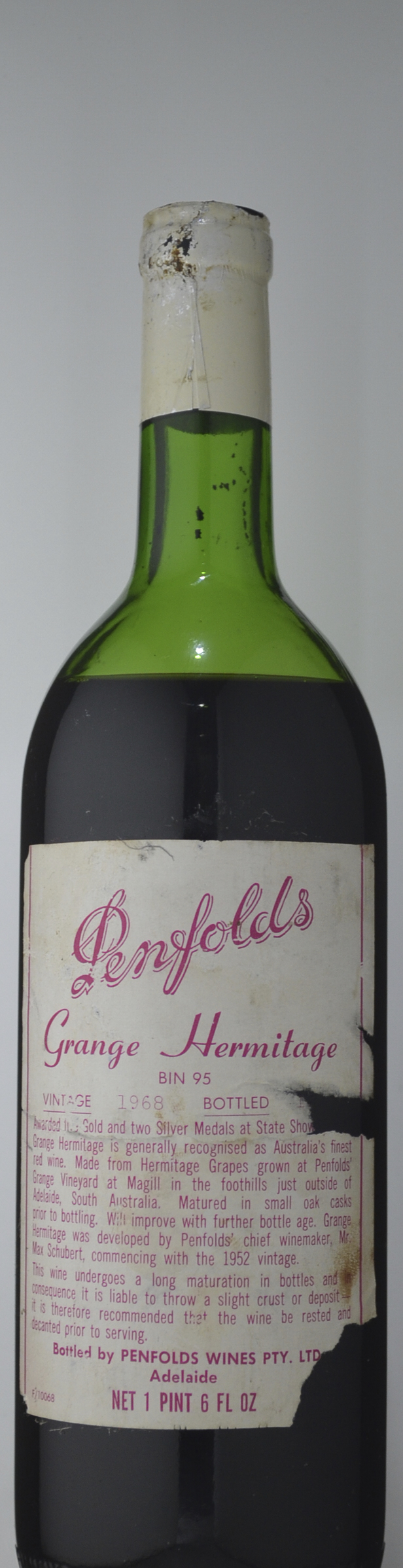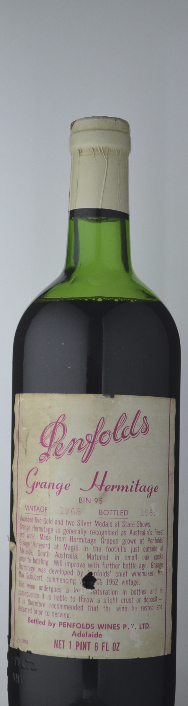 A very mature, monolithic style of Grange that has an autumnal decaying vegetation, mushroomy nose, with some hints of ashtray, currant, and caramel. The wine is medium-bodied, has some sweetness on the attack, but then narrows in the finish. Overall, it seems somewhat monolithic, with an austere finish. It is a blend of 93% Shiraz and 7% Cabernet with surprisingly low alcohol for a Grange (12.1%).Source: Robert Parker (eRobertParker.com) February, 2002 by Robert Parker