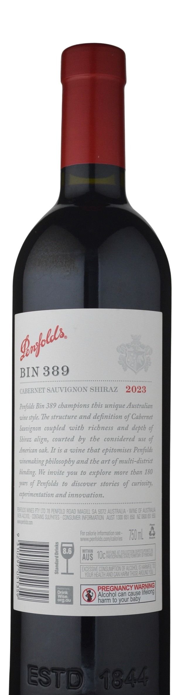 A strong release for the Bin 389. This year is a blend of 51/49% cabernet sauvignon/shiraz. Deep fruit characters of blackberry, black cherry and blueberry of considerable purity and depth, supported by hints of mixed spice, violets, creamy oak, cold black tea, panforte and earth. Strong powdered gravel tannins provide grip and support, and there is a considerable depth to the persistent finish as the wine sails slowly away. Built for the cellar. Drink from 2026.