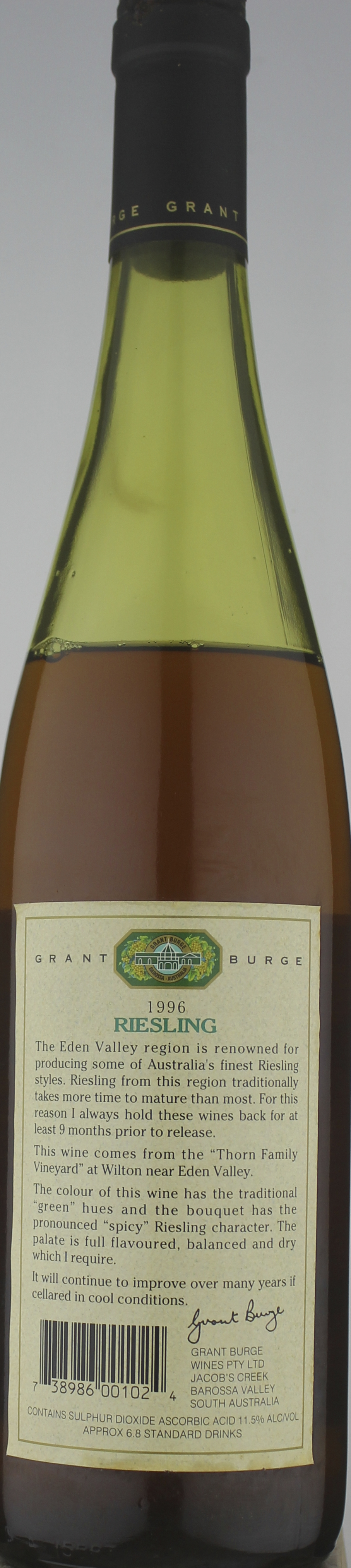 Label: lightly soiled, Capsule: evidence of leakage, Ullage: below mid shoulder