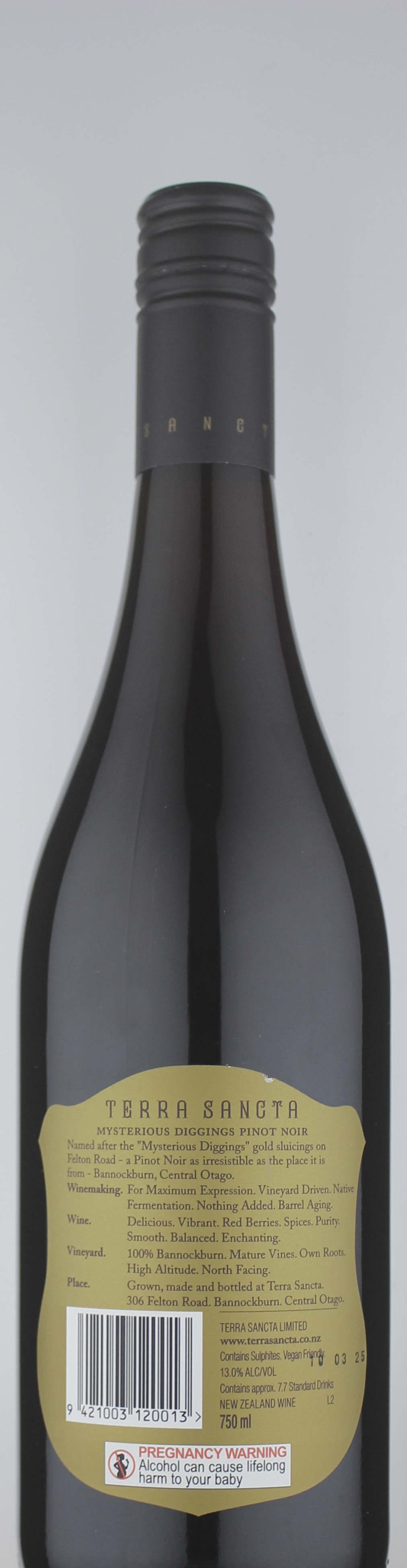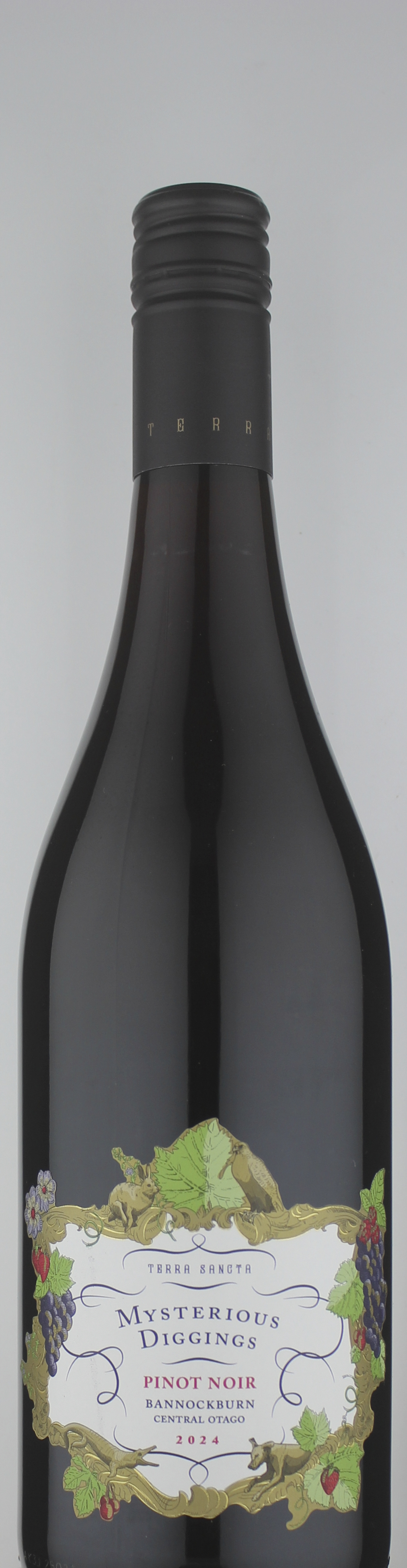 Ranked #4 in James Suckling’s Top Wines of the World 2025. New Zealand Wine of the Year 2025. Crafted from vineyard to bottle by Terra Sancta, this 100% Bannockburn Pinot Noir embodies the character of our highest altitude site, the Mysterious Diggings Vineyard. At 300 metres above sea level, vines rooted in sandy soils produce fruit of remarkable clarity and vibrancy. Fermented with 100% native yeasts, our focus is on preserving the natural energy and beauty of the fruit. The result is a pure, expressive Pinot Noir — vivid, balanced and alive with the character of Bannockburn. Drink 2025 - 2031.