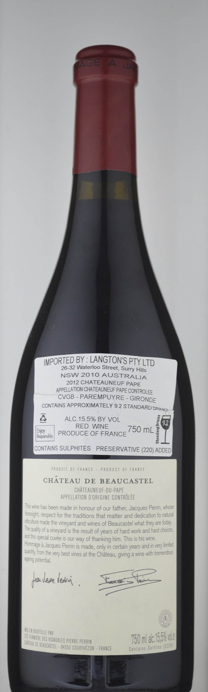 Chateau De Beaucastel Hommage a Jacques Perrin Chateauneuf du Pape Southern Rhone Red Blend 2012 » $195.00 (✔in stock) | Cellarit