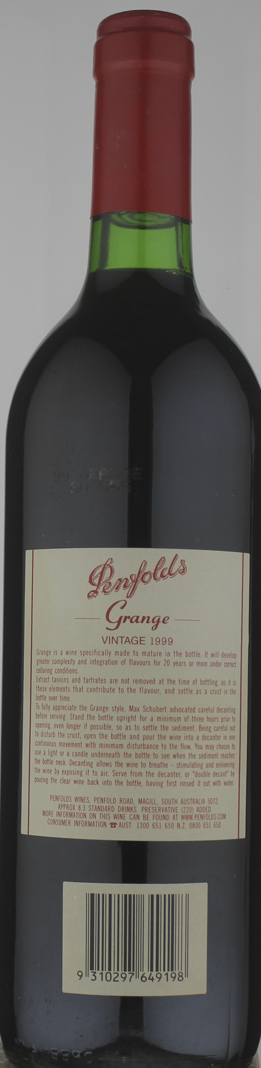 Deep brick-red colour of a mature red wine, the bouquet echoing this with mature cigarbox and roasting-pan aromas of classic aged shiraz. Roasted chestnut, traces of mocha, but it has developed through its fruit stage into a drier spectrum of aromas now. The palate is still drying from tannin, very savoury and complex, mellow and long. Tannins are still quite insistent, but it's in its prime. Drink 2023 - 2028.
