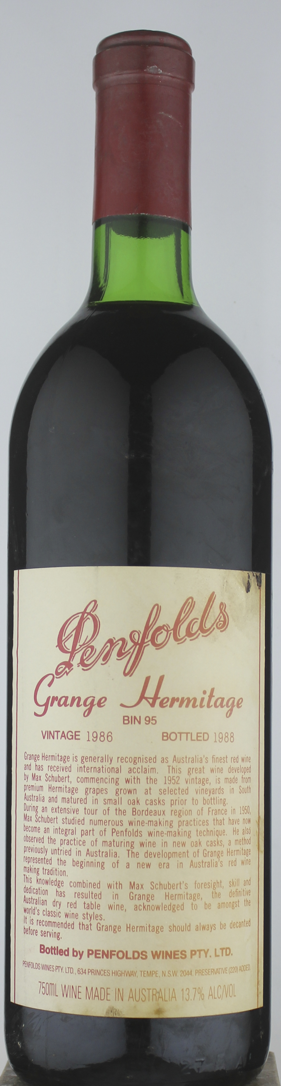 One of my favorite wines from Penfolds, the 1986 (a blend of 87% Shiraz and 13% Cabernet Sauvignon) is one of the most powerful Granges produced (14+% alcohol). At age 23, it reminds me of the way it tasted around 9 years of age. Inky/purple to the rim with an extraordinary perfume of sweet licorice, crushed pepper, blackberry liqueur, camphor, and barbecue spices, this sensationally full-bodied, concentrated, layered 1986 is still an infant in terms of its ultimate potential. It is remarkable how this wine has aged, and it’s hard to believe how certain wine geeks will subscribe to the aging ability of the Grange, but don’t believe the same is true for other old vine Shiraz wines from the Barossa and McLaren Vale. It just doesn’t make any sense. The 1986 is one of the greatest Granges for my palate, and it appears to still have 25-30 years of upside. Source: Robert Parker (Wine Advocate) June, 2009 by Robert Parker