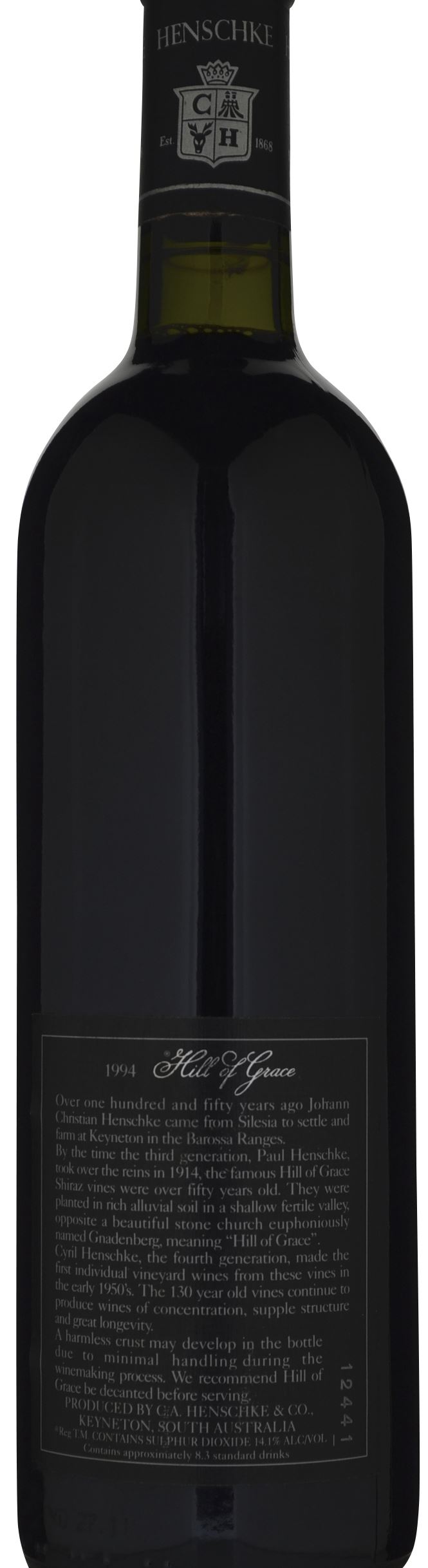 Deep brick-colored, the 1994 Hill of Grace offers notes of stewed plums, dried berries and baking spices with nuances of aniseed, vanilla and potpourri. Medium to full-bodied, it has great concentration and structure in the mouth, with crisp acid plus firm, grainy tannins, and is packed with layered, dried berry and spice flavors before finishing long with tons of remaining fruit. This wine still has many years to go. Drink it now to 2030+. Source: Robert Parker (Wine Advocate) April, 2013 by Lisa Perrotti-Brown