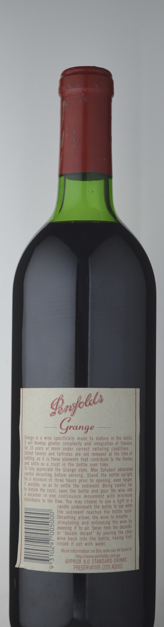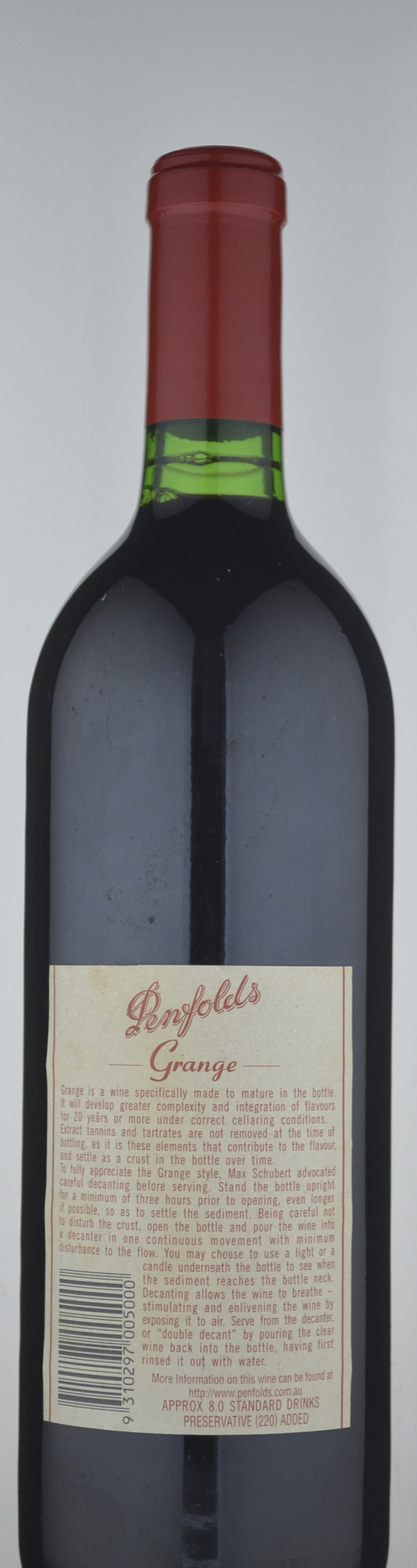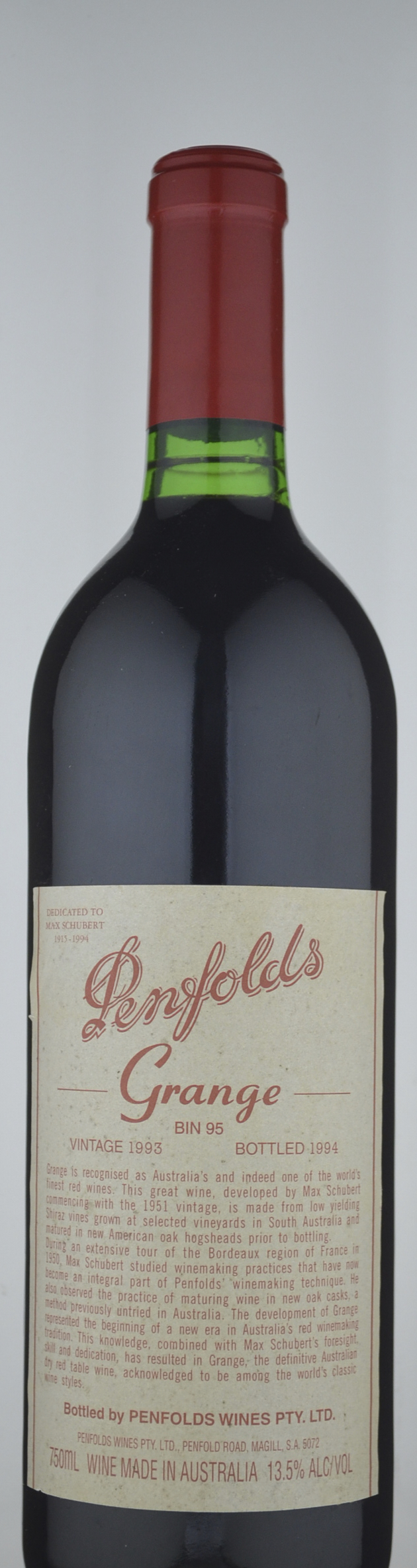1993 was a very light harvest because of excessive rainfall and mild growing conditions. This wine performed well, although it would not appear to have the nuances of the finest vintages of Grange. The wine, a blend of 86% Shiraz and 14% Cabernet Sauvignon, has an opaque purple color, a sweet nose of black currants intermixed with cedar, and earthy, almost truffle-like notes intermixed with some camphor. The wine is full-bodied, dense, somewhat monolithic, but very concentrated, powerful, and long. Anticipated maturity: 2002-2018.Source: Robert Parker (eRobertParker.com) February, 2002 by Robert Parker