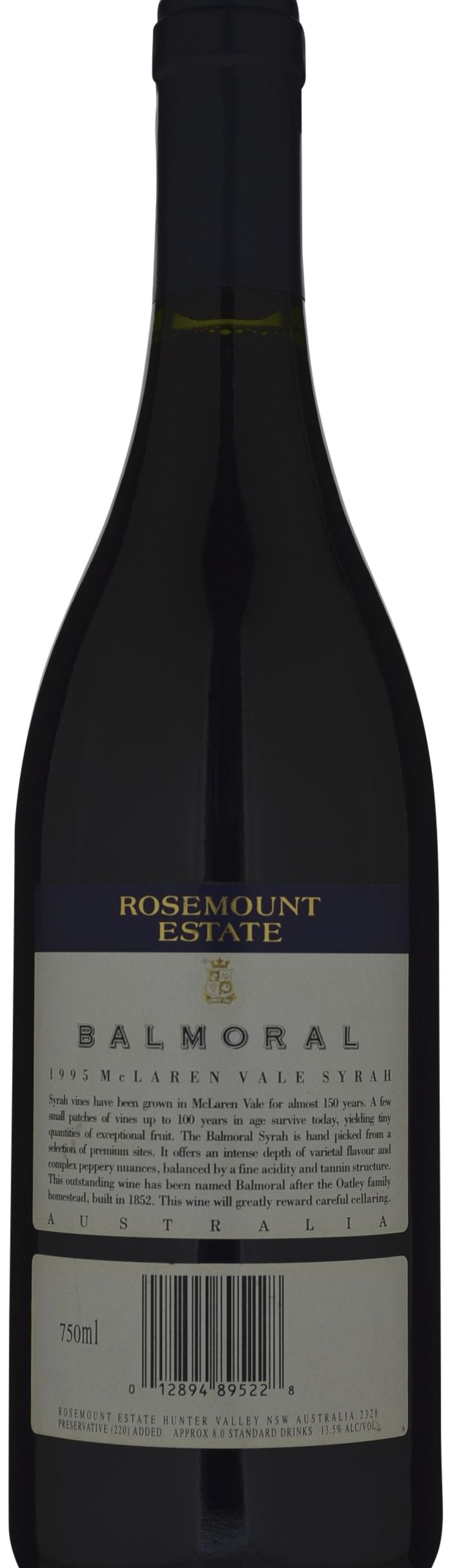 The estate-bottled 1995 Syrah Balmoral exhibits nearly excessive oak, but there is no doubting its sweet blackberry and cherry-scented nose with aromas of licorice and spicy new oak. As the wine sits in the glass, notes of bacon fat emerge. Fleshy, medium to full-bodied, and smoky, with excellent purity, this wine can be drunk now or cellared for 7-8 years.Source: Robert Parker (Wine Advocate) April, 1999 by Robert Parker