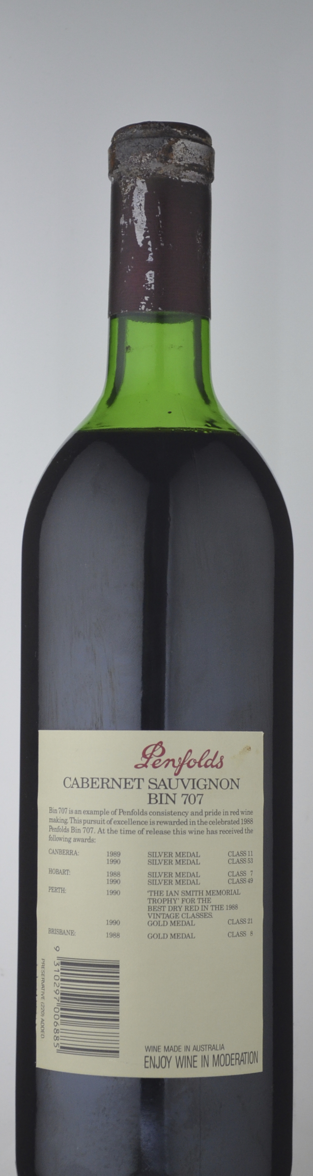Named by an ex-Qantas marketer, Bin 707 was first vintaged in 1964. The wine was not made from 1970 to 1975 when fruit was directed to other wines, nor in 1981, 1995, 2000 or 2003 (when fruit of the required style and quality was not available). Fullbodied and with proven cellaring potential, Bin 707 has a secure place among the ranks of Australia's finest Cabernets."
