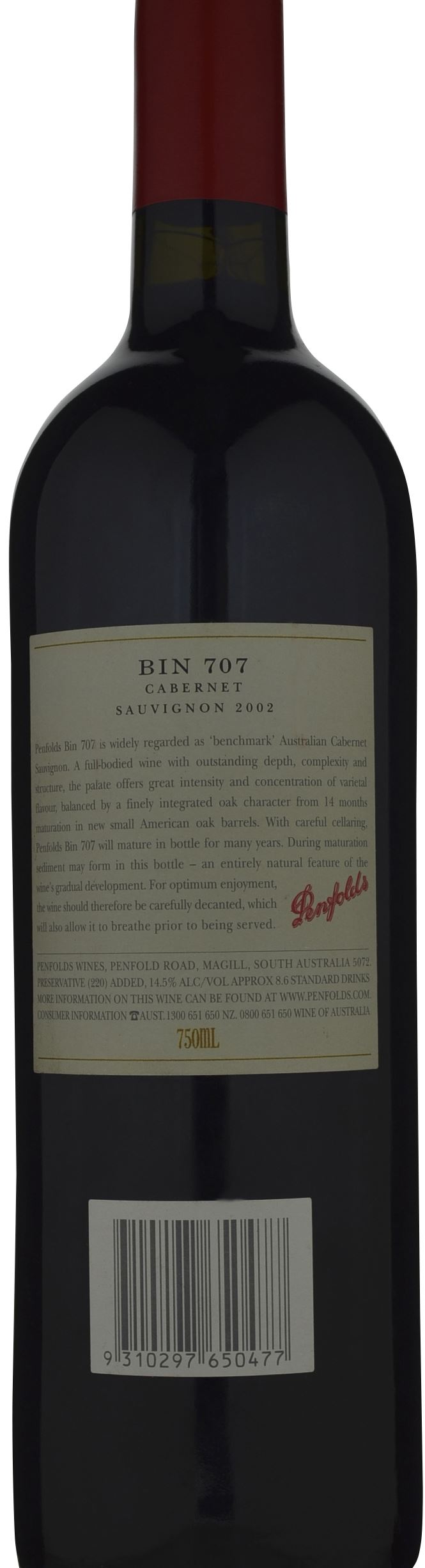 The 2002 Cabernet Sauvignon Bin 707 exhibits a broodingly dense ruby/purple color as well as a sweet nose of black currants, tapenade, cola, and spicy oak (this cuvee spends 14 months in 100% new American barrels). Pure and dense yet fresh and elegant, it appears to be one of the finest Bin 707s produced in nearly a decade. It is much more natural tasting than previous vintages, which seemed too extracted and acidified. The 2002 should drink well young, yet age for 15+ years. Source: Robert Parker (Wine Advocate) October, 2005 by Robert Parker