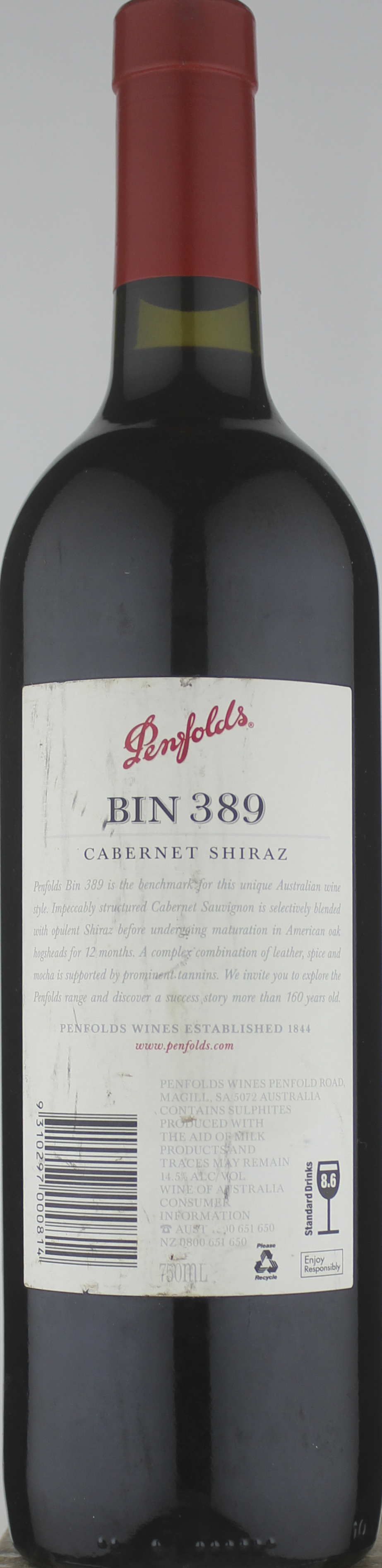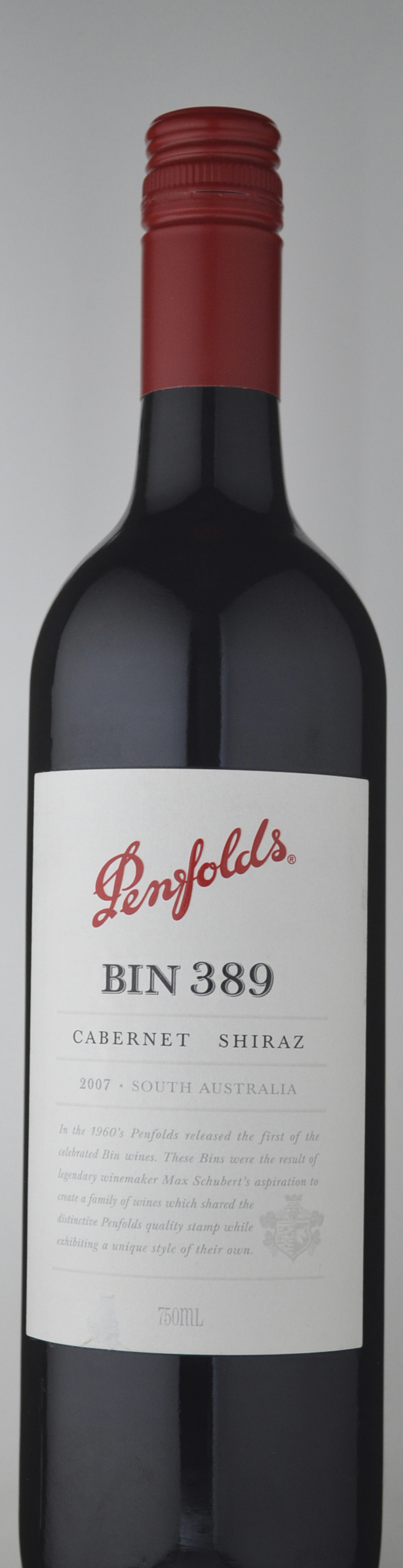 Composed of 54% Cabernet Sauvignon and 46% Shiraz, the fruit for the 2007 Bin 389 Cabernet Shiraz came from 5 different sub-regions around South Australia. Matured 12 months in American oak, 39% new, it gives a very deep garnet-purple color and aromas of blackberry preserves, warm black currant, vanilla, spices and mocha plus a slight floral lift. Full-bodied with firm, fine-grained tannins, there’s a good concentration of ripe fruit in the mouth offset by high acid and finishing long and spicy. Approachable now, it should cellar to 2018+. Source: Robert Parker (Wine Advocate) December, 2010 by Lisa Perrotti-Brown