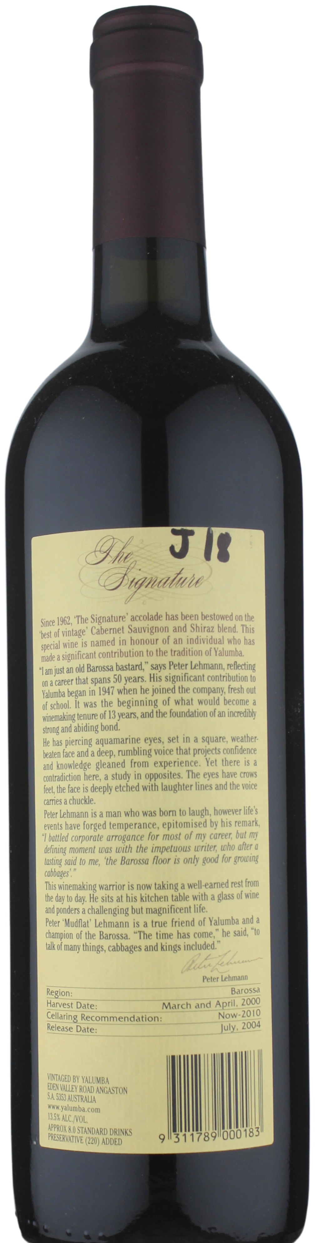While the 2000 Shiraz/Cabernet The Signature (57% Cabernet Sauvignon and 43% Shiraz) is outstanding, it is not the blockbuster this cuvee can sometimes be. Its ruby/purple color is accompanied by a spicy, earthy bouquet revealing scents of underbrush, black fruits, pepper, and background oak. This solidly made, structured 2000 will drink well for 7-10 years.