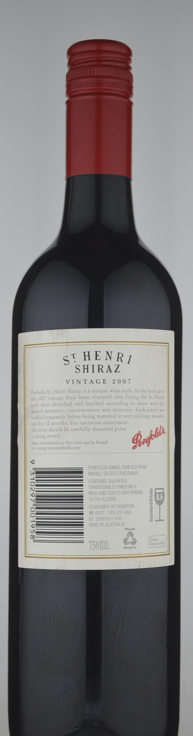 RP 93 points: Very deep garnet-purple colored, the 2007 St Henri Shiraz is a little closed at this stage, revealing subtle earthy notes over crushed blackberries, pencil lead, toast, game, smoky bacon and tree bark. Medium bodied, elegantly fruited and still very tight-knit, the palate offers beautiful purity structured with firm chewy tannins and very crisp acid that should see it through a long life. Consider drinking it 2013 to 2022+.