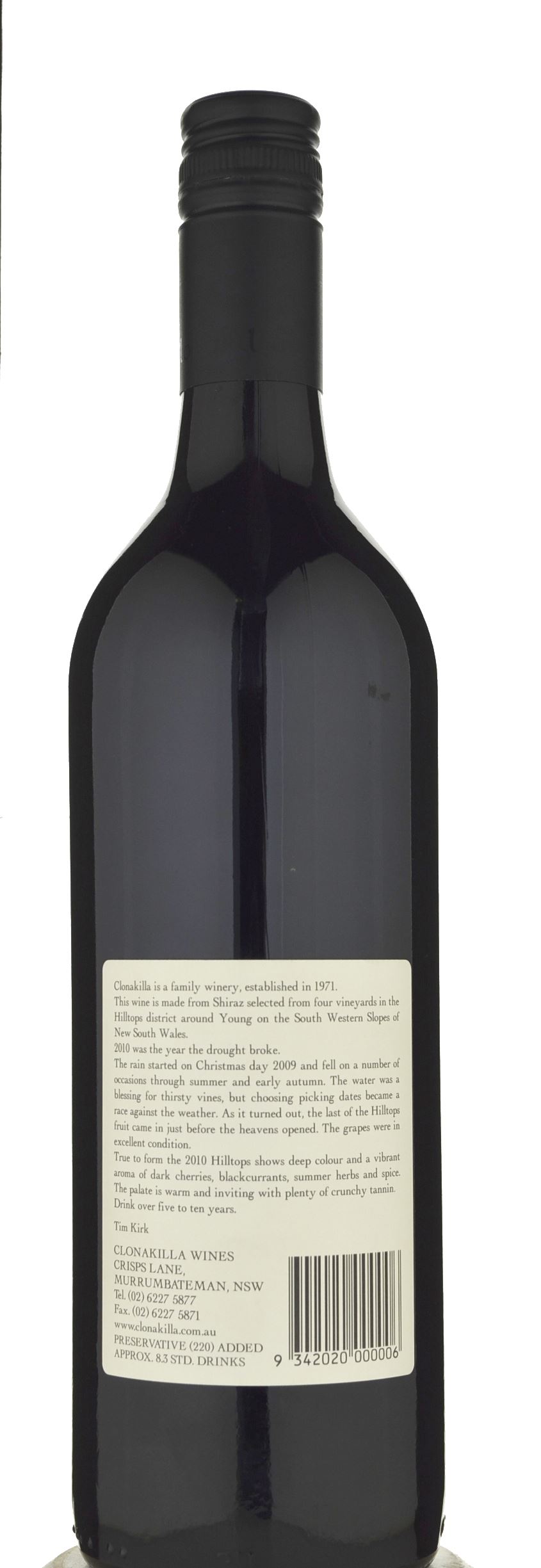 Medium to deep garnet-purple-colored, the 2010 Hilltops Shiraz offers pronounced aromas of black cherry compote, eucalyptus and warm blackberries with hints of smoky bacon and violets. Medium-bodied and generously fruited in the mouth, it has a medium level of velvety tannins and lively acid, finishing long and spicy. Drinking nicely now, it should keep to 2016. Source: Robert Parker (Wine Advocate) April, 2012 by Lisa Perrotti-Brown