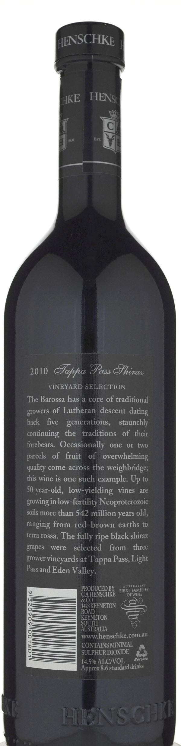 Deep garnet-purple in color, the 2010 Tappa Pass Shiraz is made with fruit from vines with over 50 years of age and matured in French oak. It has a very primary nose of warm black fruits, black plums and mulberries with nuances of chocolate, blueberry pie and baking spices. Full-bodied, concentrated and densely packed with dark fruit flavor, it has vibrant acid and firm, grainy tannins plus a long finish. Tempting to drink now, it should be at its best 2014 to 2022+. Source: Robert Parker (Wine Advocate) April, 2013 by Lisa Perrotti-Brown