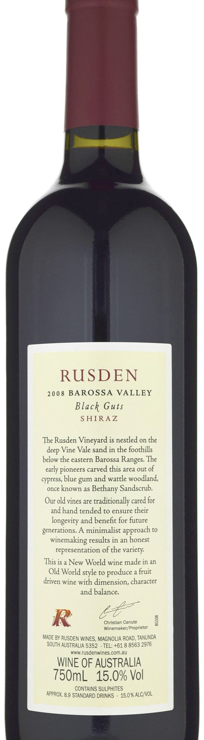 Deep garnet colored, the 2008 Black Guts Shiraz offers notes of warm mulberries, raisins and prunes over hints of baking spices, anise, tobacco and earth. Very full bodied and densely packed with dried fruit flavors, it has very crisp acidity and a medium level of velvety tannins, finishing long and a little warm. Drink it now to 2018+.