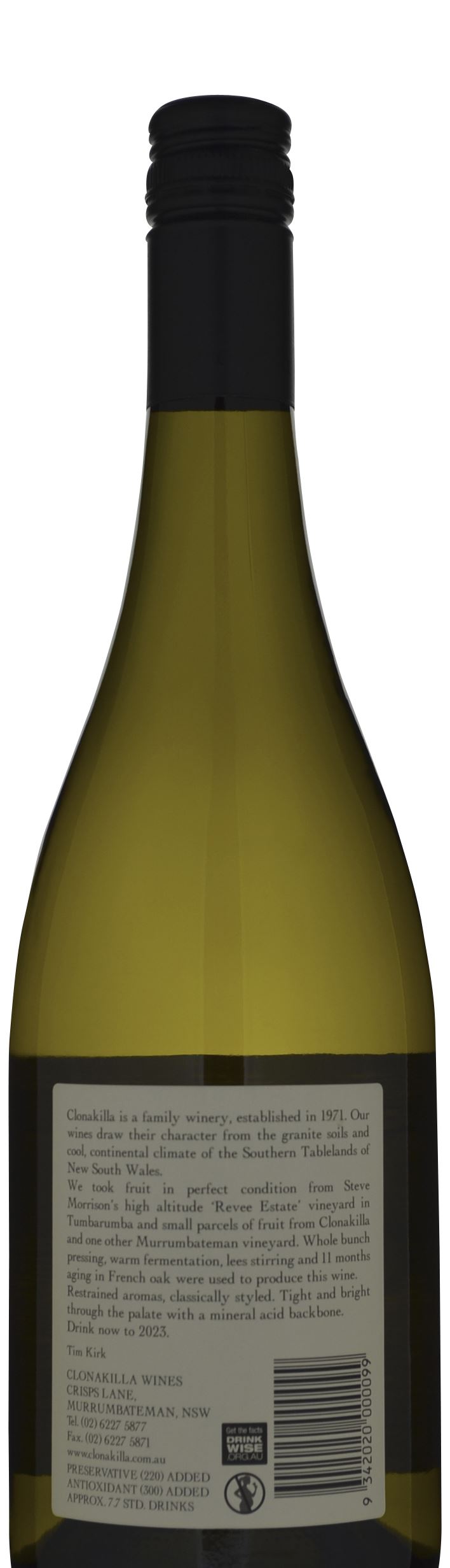 Sourced primarily from a high altitude Tumbarumba vineyard, plus small amounts from Clonakilla and one other Murrumbateman vineyard; whole bunch-pressed, warm-fermented, lees-stirred, and 11 months maturation in French oak. Brightly coloured, it focuses as much on texture and structure as on varietal fruit, but not at the expense of white flesh stone fruit and green apple flavours; natural acidity has been carefully protected. Drink to 2019.
