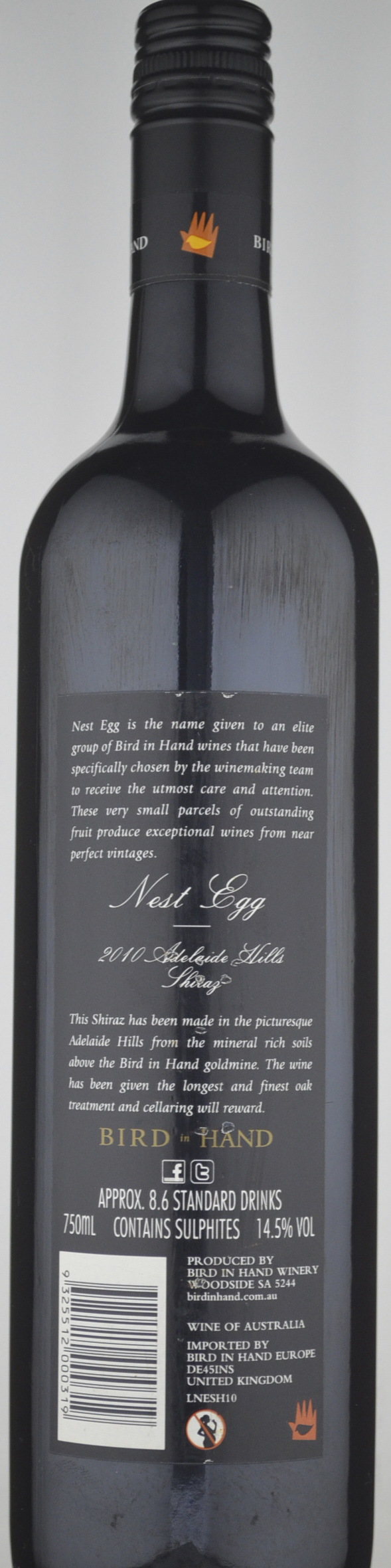 Deep garnet-purple in color, the 2010 Nest Egg Shiraz is intensely scented nose of crushed blackberries and blackcurrants with underlying nuances of dried mint, dark chocolate and star anise. Youthful blackberry flavors complemented by a subtle minty lift fill the medium-bodied palate and are supported with fine-grained tannins through a finish with great length. Drink it now to 2020+.