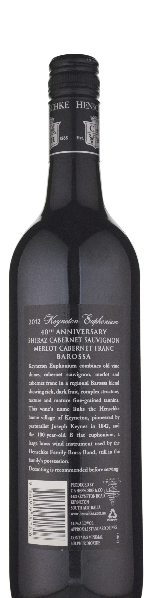 Medium garnet-purple colored, the 2012 Keyneton Estate Shiraz Euphonium explodes from the nose with lifted cherry, blackberry and mulberry notes over suggestions of licorice, sandalwood, bay leaves and cedar. Medium-bodied with mouth-filling cherry, berry and spice box flavors, it has a solid backbone of grainy tannins and lively acid, finishing very long.