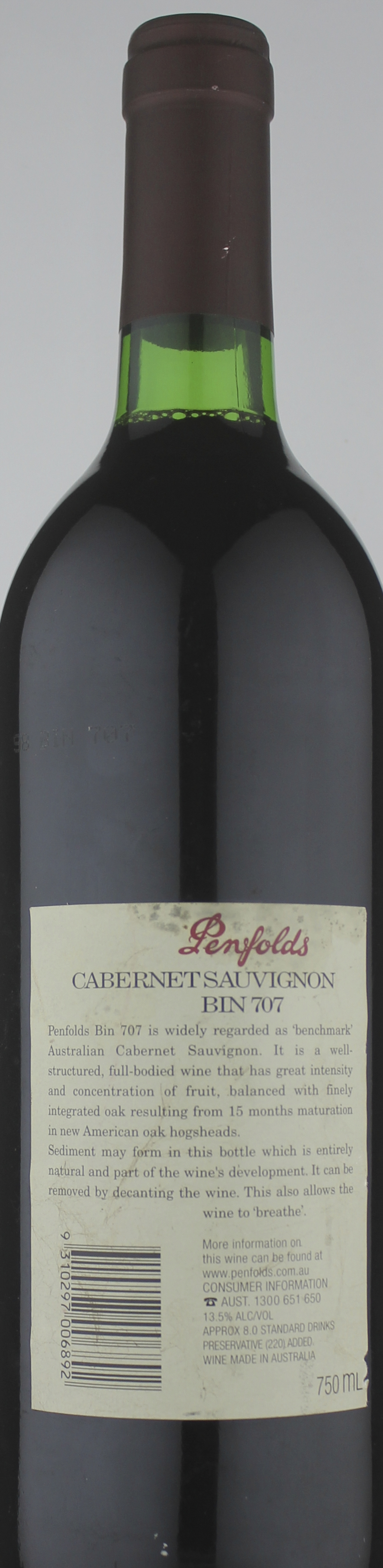The outstanding 1998 Cabernet Sauvignon Bin 707 is a thick, rich, full-bodied Cabernet emphasizing copious quantities of cassis fruit. Pure, with nicely integrated oak, acidity, and tannin, it cuts a broad swath across the palate. While still young and grapy, this 1998 is loaded with potential. Anticipated maturity: 2002-2015.Source: Robert Parker (Wine Advocate) June, 2001 by Robert Parker
