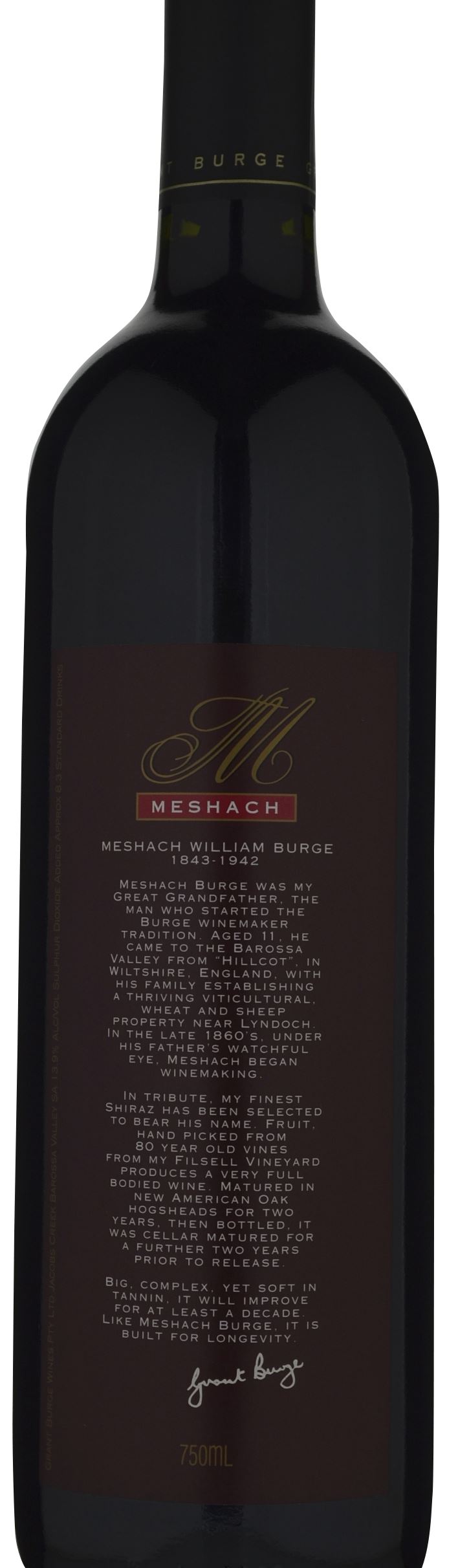 With Meshach I am seeking the epitome of the Barossa shiraz style - a big, powerful, intensely rich and robust dry red with the potential to age for 20-25 years and develop enormous complexity.