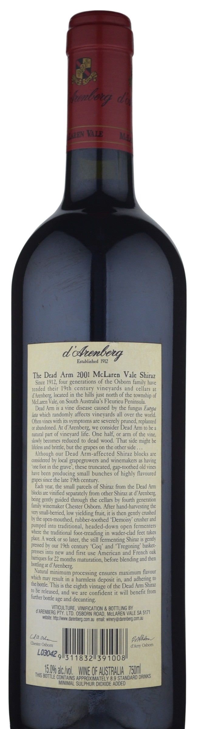 Readers should be on the look out for the 2001 The Dead Arm Shiraz, one of the greatest examples of this cuvee. Its dense black/purple color is accompanied by celestial aromas of melted licorice, graphite, blackberries, cassis, incense, anise, and toasty oak. Fabulously concentrated, with great purity, an unctuous, viscous texture, and an amazingly long, 60-second plus finish, this fabulous baby will need 5-6 years of cellaring, and should drink well over the following 20-25 years. Source: Robert Parker (Wine Advocate) August, 2003 by Robert Parker