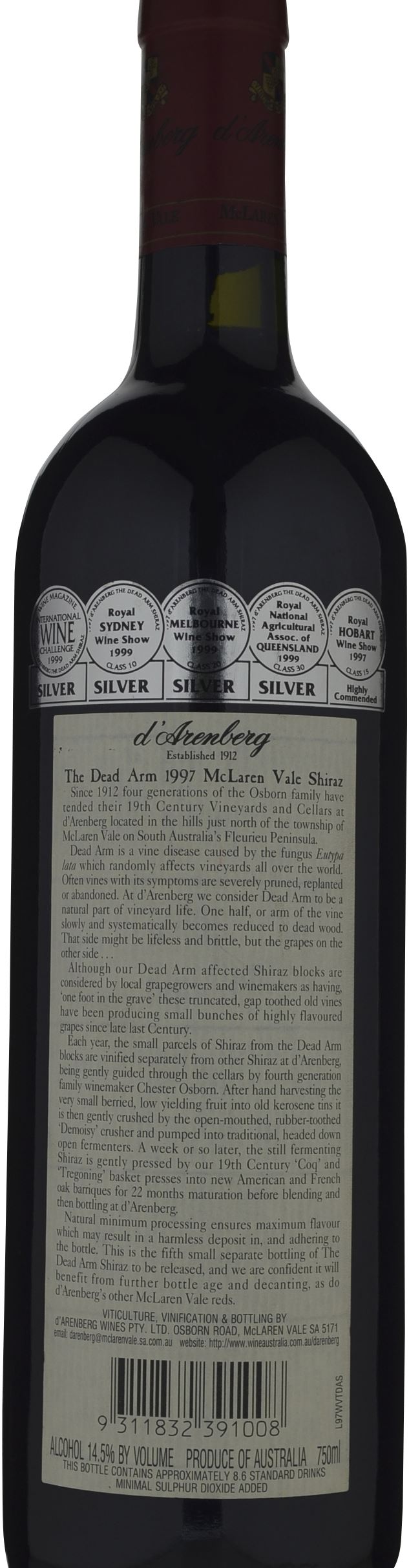 Year in and year out d''Arenberg''s finest cuvee is their spectacular Shiraz made from 100+ year old, head-pruned vines. It is an exquisite, multi-dimensional wine that is sure to make a formidable impression with readers. It is aged in 100% new oak, tipping the scales at a whopping 14.9% alcohol, yet has a glorious level of fruit and extract. The 1997 Dead Arm Shiraz exhibits an opaque purple color as well as a sweet nose of vanillin, blackberries, and licorice. The wood frames this enormously concentrated, rich, chewy wine. Multi-layered, with phenomenal concentration and length as well as moderately high tannin levels, it will be at its finest after 2-5 years of cellaring, and will keep for two decades.