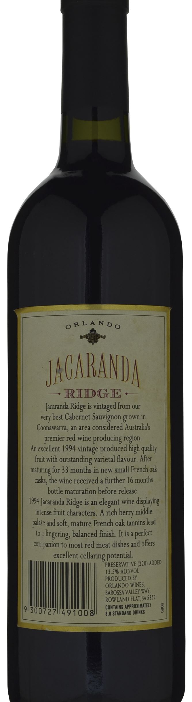 Full red-purple; the bouquet is rich, with lots of vanilla oak in typical Orlando-style, but there is plenty of earthy black fruit character there in support. A chewy palate with blackberry, chocolate and oaky flavours interwoven in a complex structure. Drink to 2006.