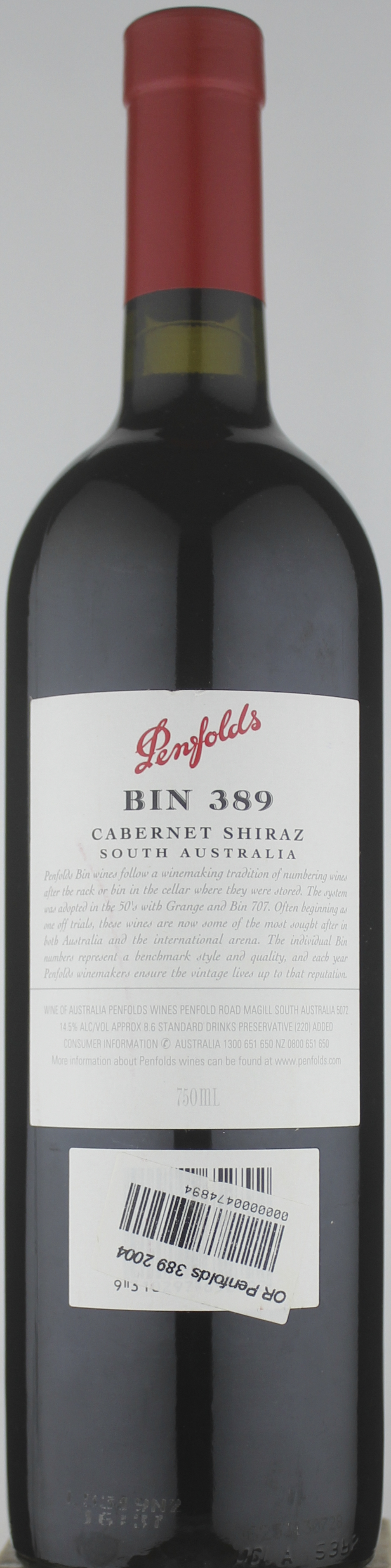 The 2004 Cabernet Sauvignon (53%) – Shiraz (47%) “Bin 389”was aged for 14 months in large oak vats. It is opaque purple-colored with an attractive bouquet of smoked meats, Asian spices, black currants, blueberry, and licorice. Medium to full-bodied, it has gobs of spicy dark fruit flavors, a smooth texture, well-hidden tannins, and 3-5 years of aging potential. Drink this lengthy blend through 2020. Source: Robert Parker (Wine Advocate) October, 2007 by Jay Miller