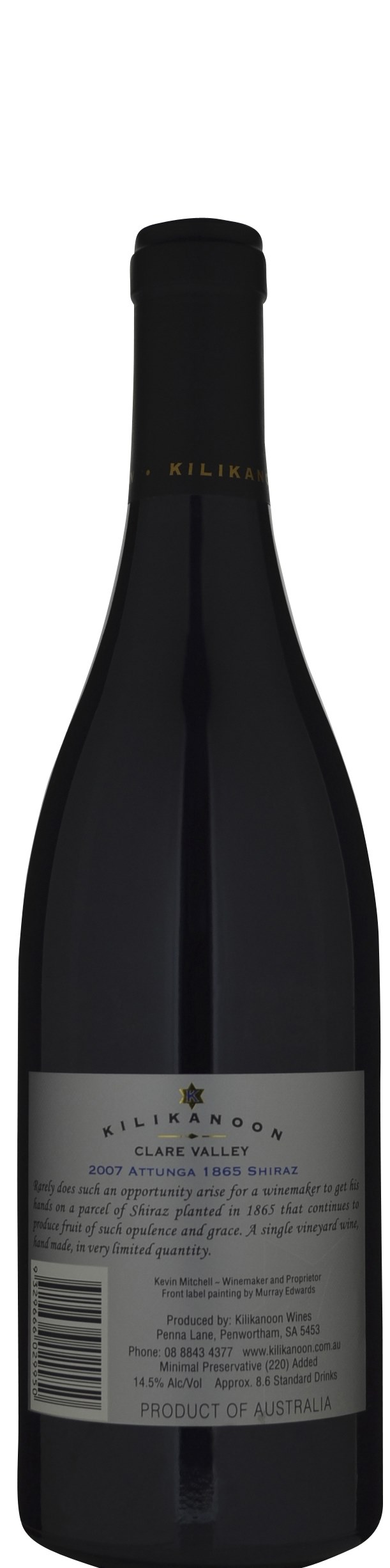 From a single vineyard planted in 1865, surely the oldest surviving in the Clare Valley. Very good colour to an exceptionally potent and massively concentrated shiraz; can't be assessed without repeated visits to the glass, gently prising open the multiple layers of blackberry fruit allowing the inherent balance of the wine to express itself. A heavily stained mediocre cork fills me with dismay. Drink to 2030.