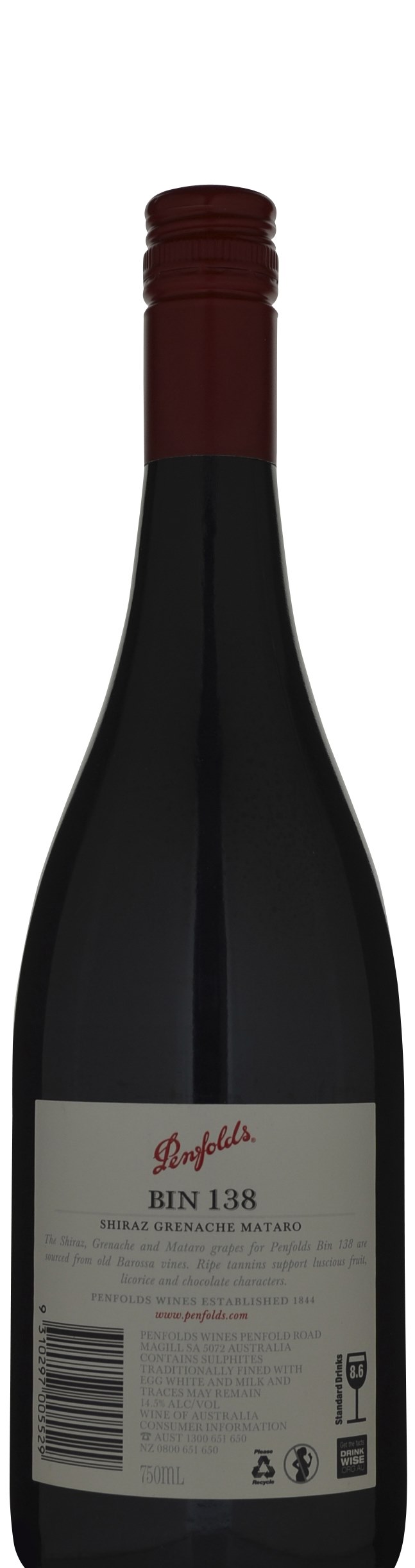 A vintage well suited to this blend of 66/23/11% shiraz/grenache/mataro, creating a wine of even flow, lively acid balance and firm, finely textured tannin support. Violet fragrance and well-defined berry fruits are layered with pepper and spice, confirming a restrained, poised and ageworthy Bin 138, set to go down among the greats. Drink to 2027.