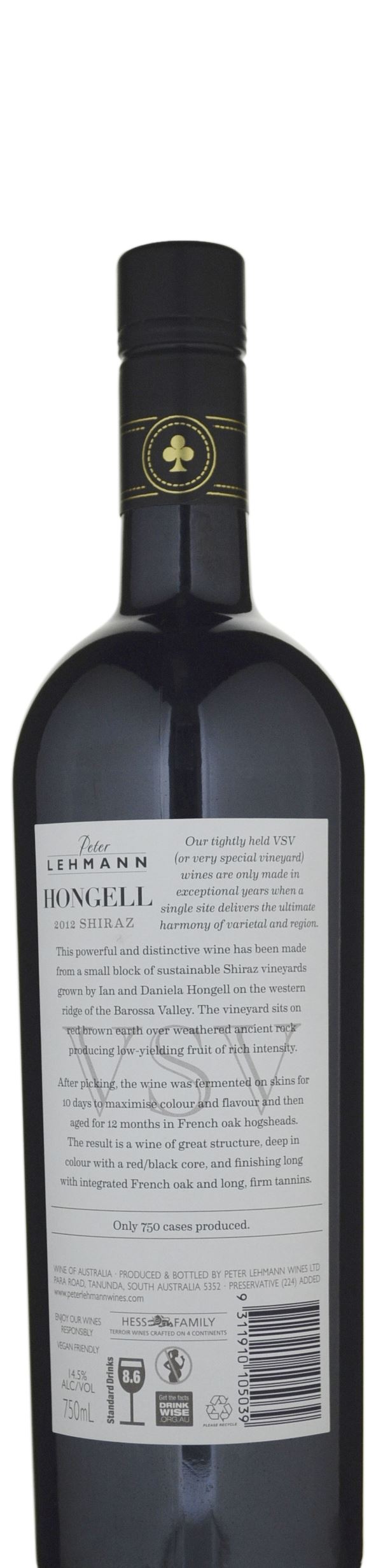From a small block on the western ridge of the Barossa Valley sustainably farmed by Ian and Daniela Hongell. Deeply coloured, it spent 10 days on skins before 12 months in French hogsheads; it is a black-fruited powerhouse that defies logic with its calm elegance derived from skilled handling of its ripe tannins and subtle, cedary French oak. 750 dozen made. Drink to 2042.